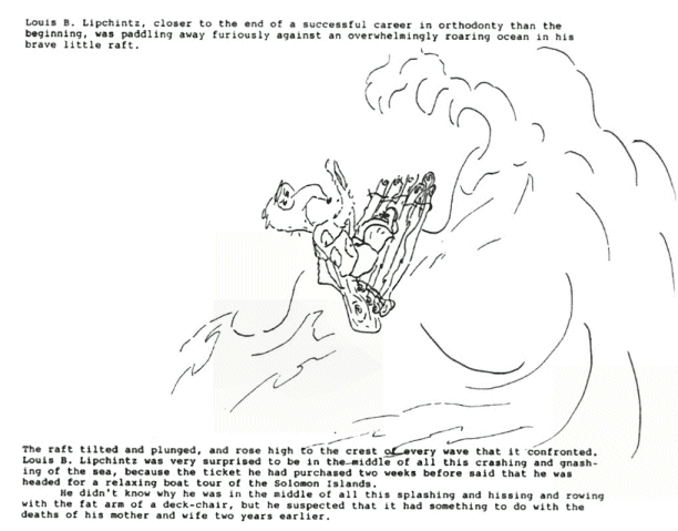 Louis B. Lipchintz, closer to the end of a successful career in orthodonty than the beginning, was paddling away furiously against an overwhelmingly roaring ocean in his brave little raft. The raft tilted and plunged, and rose high to the crest of every wave that it confronted. Louis B. Lipchintz was very surprised to be in the middle of all this crashing and gnashing of the sea, because the ticket he had purchased two weeks before said that he was heading for relaxing boat tour of the Solomon Islands. He didn't know why he was in the middle of all this splashing and hissing and rowing with the fat arm of a deck chair, but he suspected that it had something to do with the deaths of his mother and wife two years earlier. |