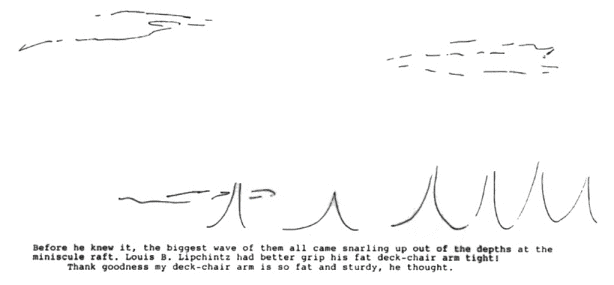 Before he knew it, the biggest wave of them all came snarling up out of the depth at the miniscule raft. Louis B. Lipchintz had better grip his fat deck-chair arm tight! Thank goodness my deck-chair arm is so fat and sturdy, he thought. |