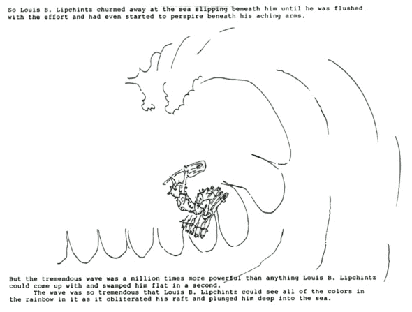 But the tremendous wave was one million times more powerful than anything Louis B. Lipchintz could come up with and swamped him flat in a second. The wave was so tremendous that Louis B. Lipchintz could see all of the colors of the rainbow in it as it obliterated his raft and plunged him deep into the sea. |
