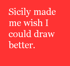 | Sicily made me wish I could draw better. As a way of seeing better. Photographs capture an image without ever having to really look at the subject. This is why drawings and paintings are better than photos. Especially thinking of that man last night at Piazza Navonna, drawing the little girl. That was much better than a photograph. Looked as realistic as a Black and White photo, but more alive, more magical. Some of those old buildings in Sicily, just crumbling in the middle of a field, they must've dated to the Roman Empire. Maybe before. | |||||||||||||||||||||||||||||||||||